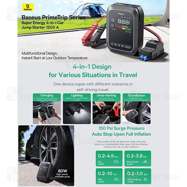در این مدلBS-CH014، قابلیت جامپ استارتر ۱۲ ولت برای مواقع اضطراری روشن کردن خودرو با جریان پیک بالا تعبیه شده است. علاوه بر آن، به عنوان پاوربانک عمل میکند و از طریق پورتهای USB، انرژی لازم برای شارژ موبایلها را تأمین میکند. ویژگی برجسته این مدل، وجود پمپ باد داخلی است که امکان باد کردن تایر خودرو، توپهای ورزشی یا سایر لوازم بادی را در هر مکانی فراهم میسازد. این ترکیب، دستگاه را به یک کیت نجات ضروری و کمحجم برای سفرهای جادهای تبدیل میکند. تمام این عملکردها معمولاً در یک قاب جمعوجور و با استفاده از باتری لیتیوم پلیمری با ظرفیت قابل توجه ادغام شدهاند.