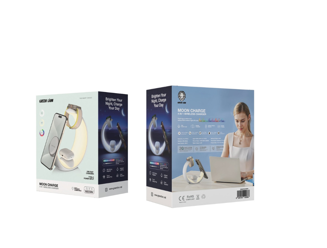 شارژر Green Lion Moon Charge 4 in 1 یک ایستگاه شارژ وایرلس چندکاره با طراحی زیبا و عملکرد کاربردی است که به شما اجازه میدهد چند دستگاه را بهصورت همزمان و بدون کابل شارژ کنید 📱⌚🎧💡. این شارژر با پشتیبانی از شارژ سریع تا 15 وات و امکانات جانبی مثل نورپردازی RGB و سنسور لمسی برای تنظیم روشنایی، تجربهای راحت و منظم برای شارژ دستگاههای هوشمند فراهم میکند.
