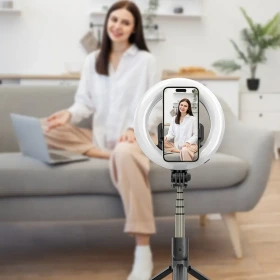 این رینگ لایت با یک دسته تلسکوپی همراه است که تا چندین مرحله باز میشود و قابلیت استفاده بهعنوان پایه نگهدارنده (Tripod) نیز دارد.