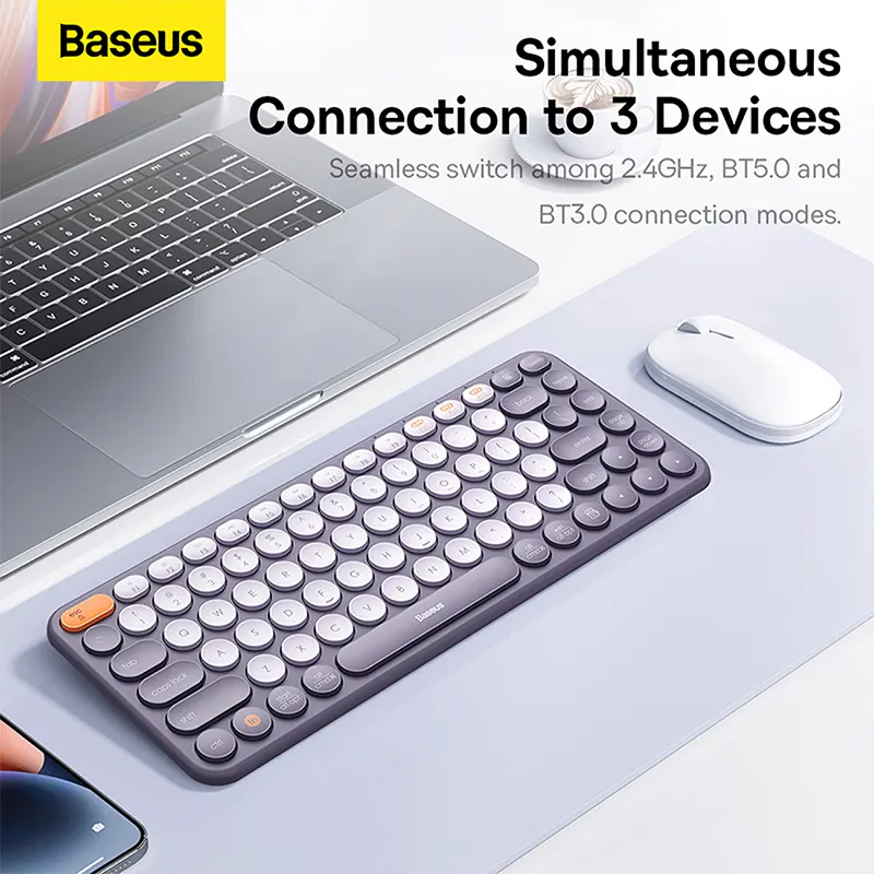 صفحه کلید را با 3 دستگاه به طور همزمان جفت کنید و به راحتی بین آنها جابجا شوید. Baseus K01B از طریق بلوتوث 3.0/5.0 و در باند 2.4G به دستگاههای سازگار متصل میشود و سیگنال پایدار تا 20 متر ارائه میدهد. این صفحهکلید از سیستمعاملهای Windows، iOS، Linux، Harmony OS و Android پشتیبانی میکند، بنابراین با دستگاههایی مانند لپتاپ، تلفنهای هوشمند، تبلتها یا رایانهها عالی کار میکند. شما می توانید به راحتی بین سیستم ها با ترکیبی از دکمه ها جابجا شوید.