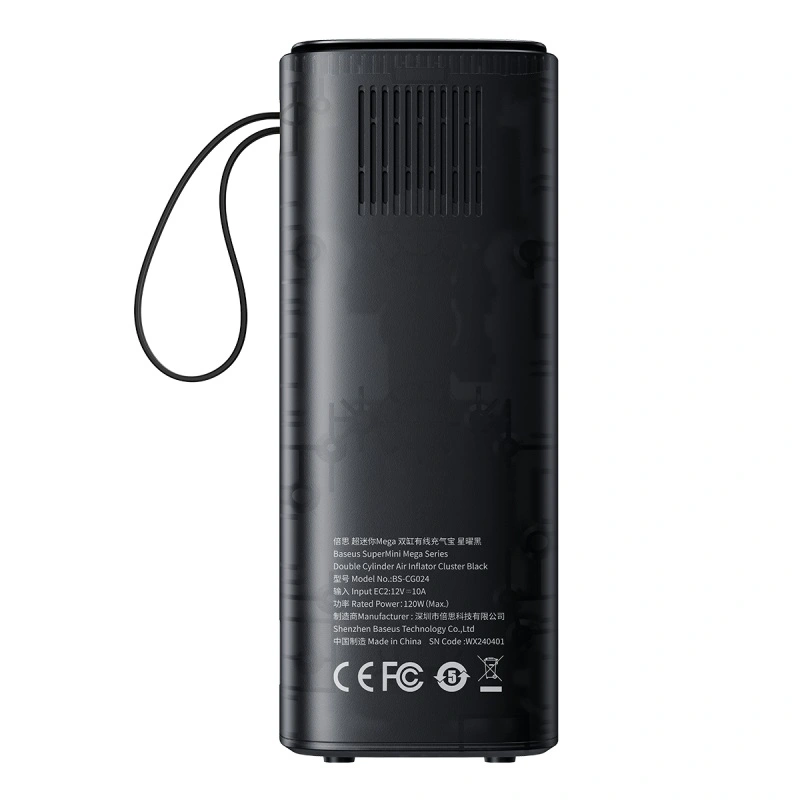 تکنولوژی مگاسریع: این مدل با نام کامل Baseus SuperMini Mega Series Double Cylinder Air Inflator، انقلابی در سرعت باد کردن تایرها است.