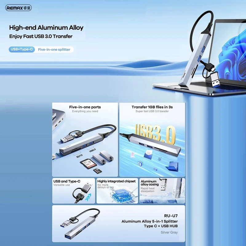 REMAX-- RU-U7 Aluminum Alloy Series 5 in 1 Type-C+USB Hub