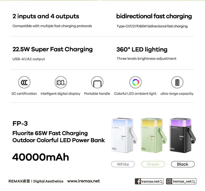 پاوربانک REMAX Fluorite 65W 40000mAh برای استفادههای طولانیمدت و شرایط خارج از خانه طراحی شده است.توان خروجی ۶۵ وات واقعی امکان شارژ سریع لپتاپهای سازگار، تبلت و گوشی را فراهم میکند.ظرفیت بالای ۴۰۰۰۰ میلیآمپر ساعت نیاز به شارژ مجدد مکرر را به حداقل میرساند.پشتیبانی از استاندارد Power Delivery باعث پایداری و سرعت بالای انتقال انرژی میشود.نورپردازی LED رنگی وضعیت عملکرد دستگاه را بهوضوح نمایش میدهد.